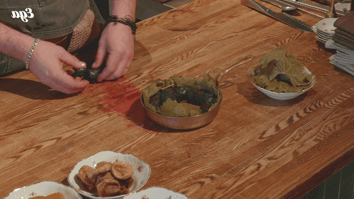 Mix the pre-prepared homemade pepper paste (roasted peppers peeled and blended with olive oil) with the remaining broth and pour it over the dolma so that the liquid is slightly above the surface of the leaves.