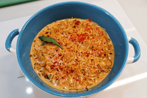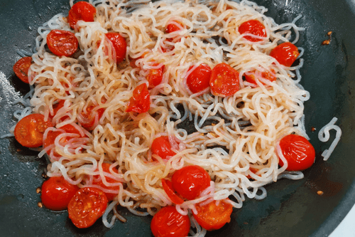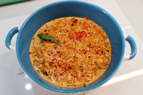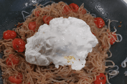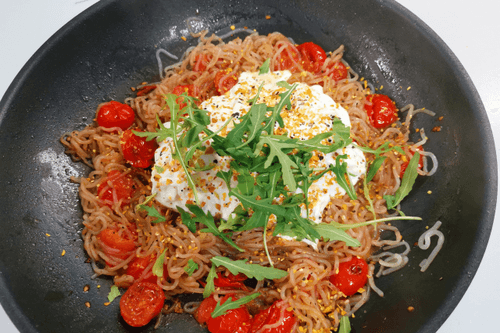 Spaghetti with stracciatella cheese is a simple yet exquisite dish of Italian cuisine that combines the tenderness of pasta with the creamy texture of stracciatella cheese. This cheese, originating from the Apulia region, is known for its softness and rich dairy flavor. In this recipe, it complements the sweetness of cherry tomatoes, the spiciness of dried onion, and the freshness of arugula. Olive oil gives the dish a silky texture while sea salt and black pepper enhance its aroma. Shirataki spaghetti makes the dish lighter, perfect for those watching their diet. Served hot with melting cheese and juicy tomatoes, it creates a harmony of flavors that transports you to sunny Italy.