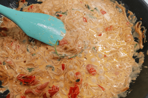 Add spaghetti to the tomatoes. Increase the heat slightly.