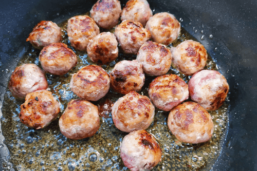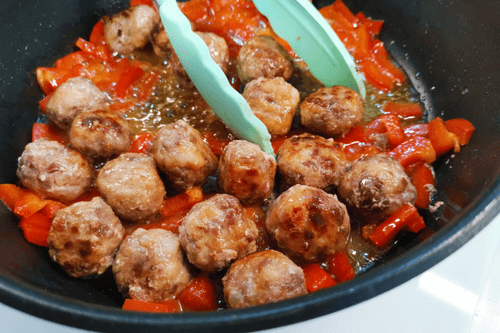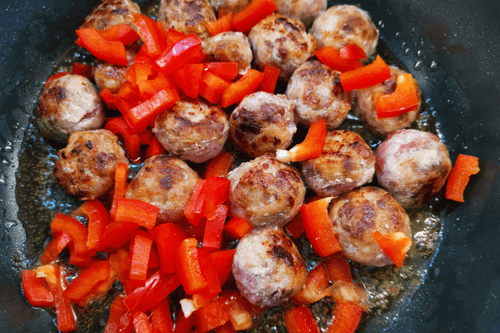 Form meatballs from the minced meat and place them in the pan. Fry on high heat until golden brown, stirring occasionally.