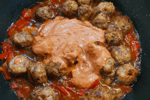 Wok with meatballs is a vibrant dish of Pan-Asian cuisine that combines rich sauce flavors, aromatic spices, and the tenderness of meatballs. Its roots trace back to the traditions of quick cooking in a wok popular in Asia. Shirataki noodles make it light, while the blend of tomato and chili sauce adds spiciness. Broccoli and bell peppers add fresh notes, and sesame completes the composition with a nutty touch. Perfect for a hearty dinner or lunch, this dish impresses with its balance of textures: the softness of the noodles, juiciness of the meatballs, and crunchiness of the vegetables. It cooks quickly while preserving the natural flavors of the ingredients and is served hot, filling the home with spice aromas. A delight for lovers of Pan-Asian cuisine!