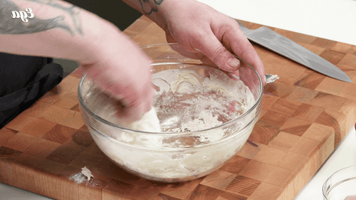 Roll the dough into a sausage, cut it into pieces the size of a walnut, and roll them into balls. Place the balls in a bowl and sprinkle them with flour.