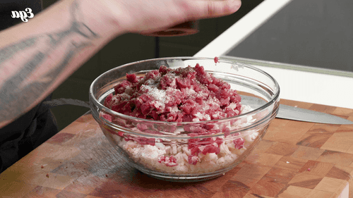 Add salt and pepper to the meat with onions and fat tail, mix and let it marinate. You can salt according to your own feelings or use a formula where the weight of salt should be 1.7% of the total filling weight. For example, for four servings, this would be 2.27 g of salt.