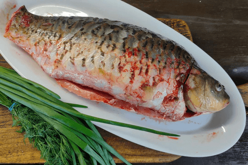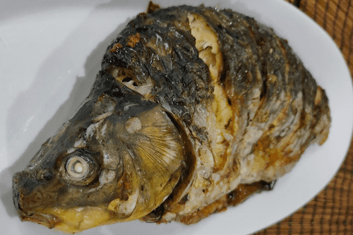 Carefully transfer the cooked carp to a dish and serve it at the table.