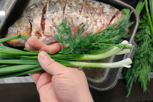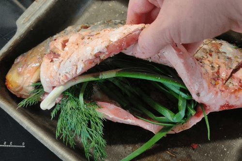 Place the carp on a baking tray or in a baking dish, rubbing spices inside and out.