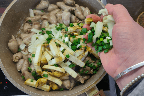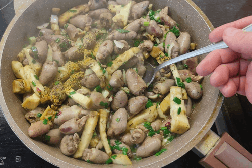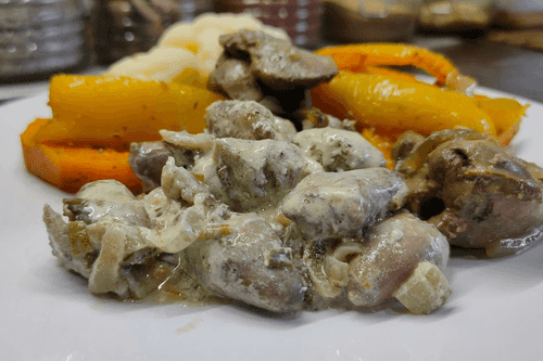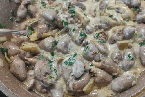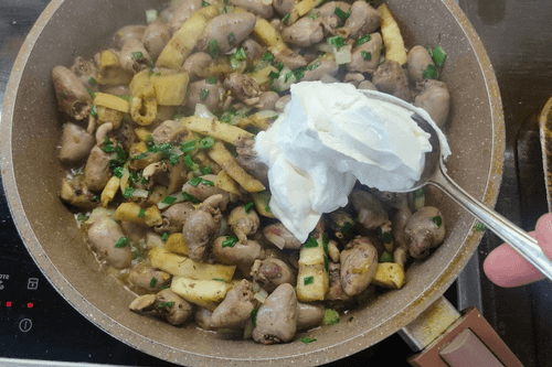 Куриные сердечки, тушенные с овощами в сметанном соусе, – это нежное и ароматное блюдо русской кухни, которое сочетает в себе простоту приготовления и богатство вкусов. Исторически субпродукты, такие как сердечки, активно использовались в русской гастрономии благодаря их питательным свойствам и доступности. Обжаренные на сильном огне, сердечки приобретают насыщенный мясной вкус, а добавление баклажана и лука делает текстуру блюда сочной и насыщенной. Сметанный соус придает мягкость и легкую кислинку, прекрасно объединяя все ингредиенты. Это блюдо идеально подойдет как для уютного семейного ужина, так и для подачи с гарниром, например, картофельным пюре или гречневой кашей. Его богатый, насыщенный вкус и кремовая текстура делают его любимым среди ценителей домашней кухни.