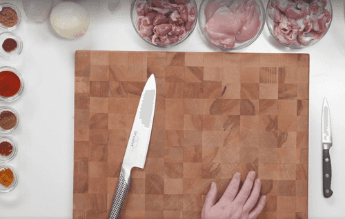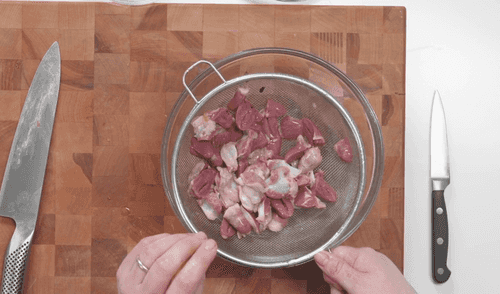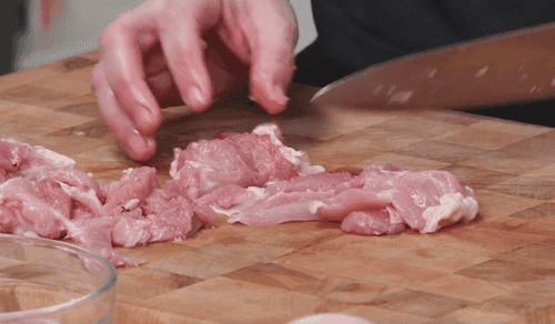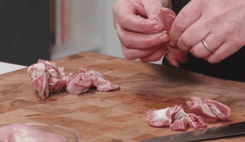 Cut the thigh fillet into small pieces, removing the tough joints.