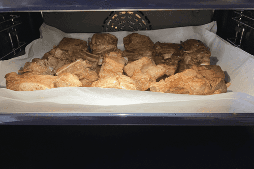 Place in a preheated oven at 200 degrees. After 1 hour, remove the foil and bake for another 15 minutes.