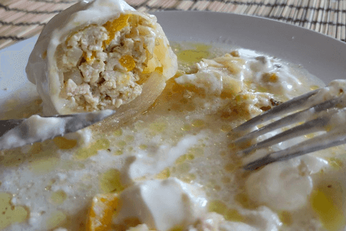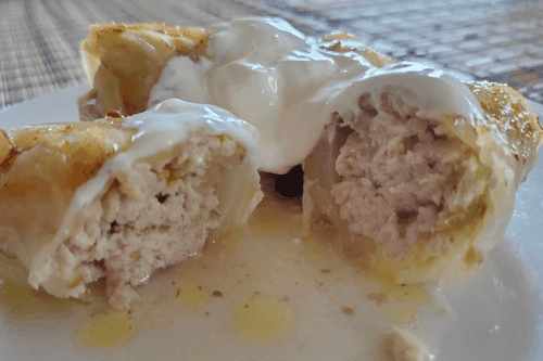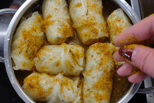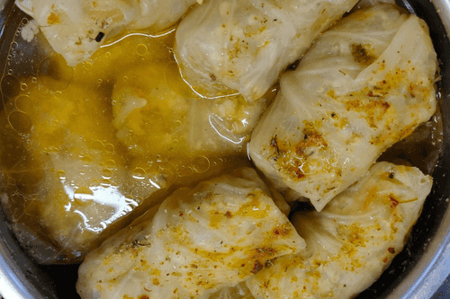 Wrap all the cabbage rolls (until the filling runs out) this way and place them tightly in one or two rows in a pot, pouring water to almost cover all the rolls.