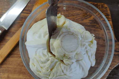 Place the cabbage in a deep bowl and carefully cut out the core with a knife.