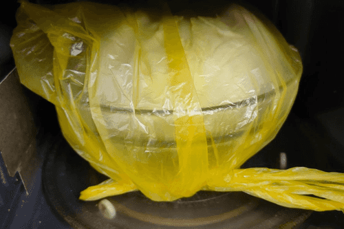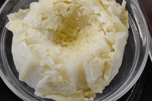 Put the cabbage in a bowl in a bag, then place it in the microwave for 10-30 minutes (depending on the ripeness of the cabbage and the softness of its leaves). Check readiness by periodically taking it out and determining the softness of the leaves (careful: hot!).