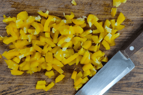 While the cabbage is cooking, finely chop the pepper.