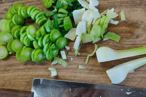 Also finely chop the head, stem, and leaves of the garlic.