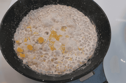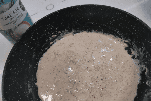 Pour cream into a dry heated pan, add ground black pepper and flour. Mix immediately.