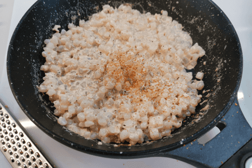 After 2 minutes, season with nutmeg, stir, and remove from heat.