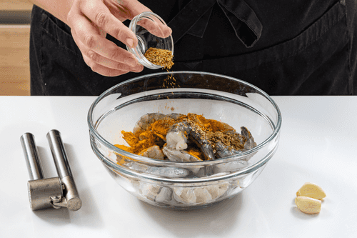 Transfer the shrimp to a bowl, add cumin, coriander, turmeric, and 2 crushed garlic cloves.