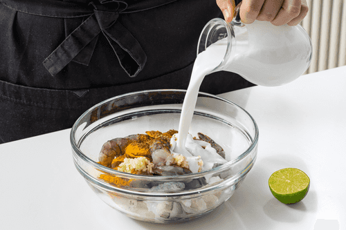 Pour the shrimp with coconut milk and half of the lime juice. Mix well and let marinate for an hour.