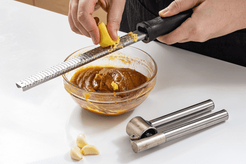 Add the pressed leftover garlic and grated ginger. Mix everything.