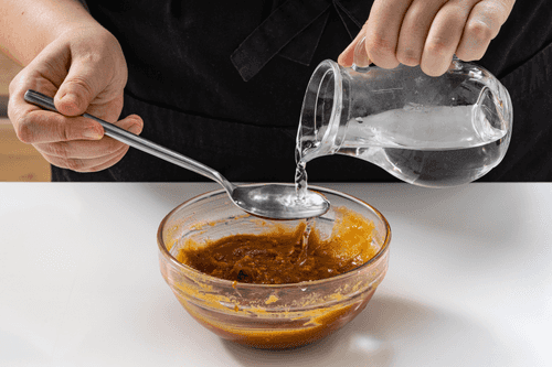 Gradually mix in warm water, one spoon at a time, to achieve the desired sauce consistency.