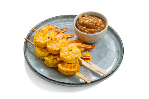 Shrimp skewers are a true masterpiece of Pan-Asian cuisine, combining exotic aromas and the delicate taste of seafood. The dish's roots trace back to the street food traditions of Southeast Asia, where seafood is grilled over an open flame, infused with spicy seasonings and coconut notes. Shrimp marinated in coconut milk with lime and spices acquire a piquant depth of flavor, while the light aroma of grilling reveals their tender structure. Peanut sauce adds richness and balance, merging sweet, salty, and spicy tones. This is the perfect choice for summer evenings and friendly gatherings, served with fresh vegetables or rice. Shrimp skewers embody simplicity and sophistication in every bite.