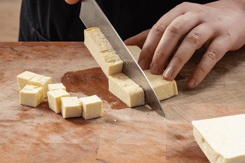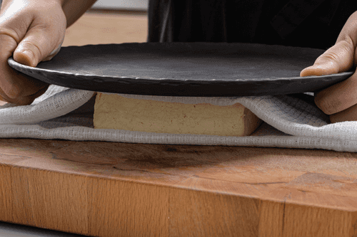 First, you need to squeeze the water out of the tofu so it has room to absorb the marinade. To do this, place the tofu on a dry towel, cover it with another towel, and put something heavy on top, like a cutting board and a plate. Press down gently (the key is not to overdo it and crush the tofu), then move the cheese to a dry part of the towel and repeat the same actions a few more times.