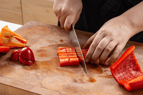Remove the seeds and white veins from the pepper, and cut into squares of 2-3 cm sides.