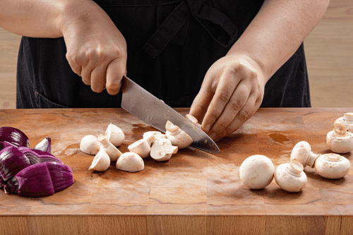 Chop the onion coarsely. If the mushrooms are large, cut them in half or into quarters. Leave the small ones whole.