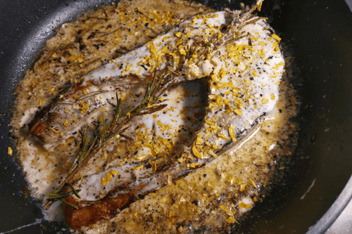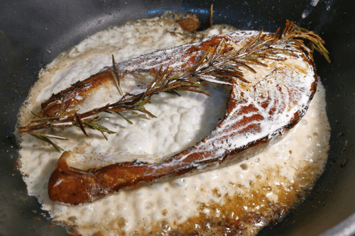After 3-4 minutes, flip it over and place rosemary on top. Fry for another 2-3 minutes.