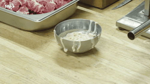 Pour in cold wine and mix the minced meat by beating it with your fists until protein threads form. If the well-mixed minced meat is placed on your palm and turned over, it will not fall but remain hanging on the palm.