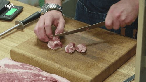 Cut the meat into small cubes and send it to the freezer for 30 minutes.