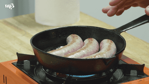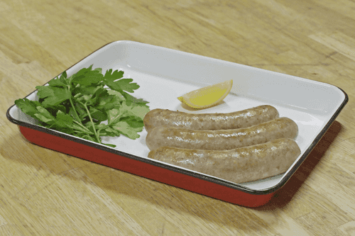 Cook the pork sausages in a pan over low heat until golden brown, then finish cooking in the oven or covered in the pan with a little water. The temperature of the cooked sausages should be 72–75 degrees.