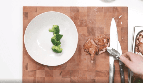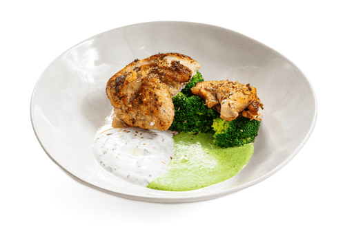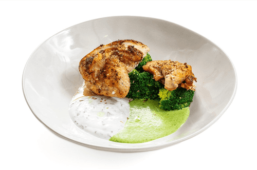 Place the chickens on a baking tray and send them to an oven preheated to 180 degrees for 20-25 minutes. Two minutes before they are done, add broccoli to the tray to warm it up.