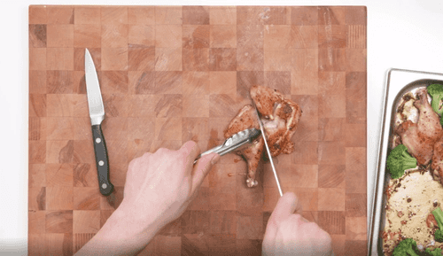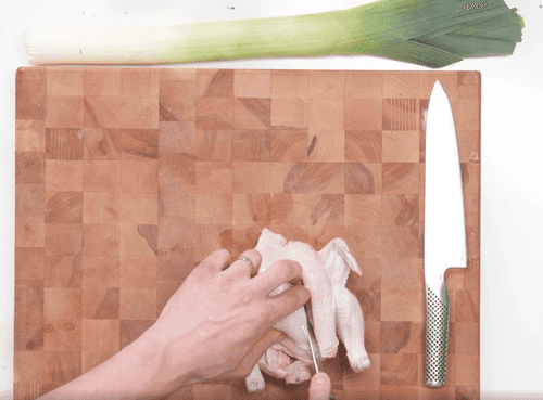 Carefully cut the chicken carcasses along the bones with a knife. Also carefully cut the thigh bones, while leaving the bones in the shins and wings.