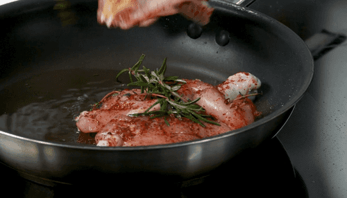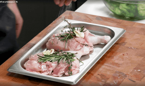 Place a sprig of thyme and rosemary on the chicken, half a clove of garlic, sprinkle with oregano, grilling spices, salt, and pepper. Drizzle with olive oil.