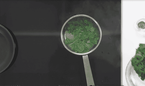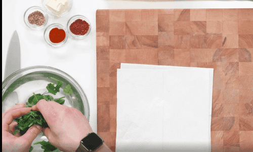 Blanch spinach and parsley leaves in boiling water for 20 seconds. Then transfer to ice water.