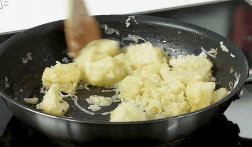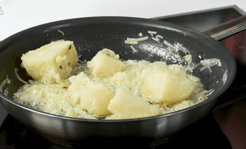 Add potatoes to the onion, mash with a spatula right in the pan - it should absorb the oil.