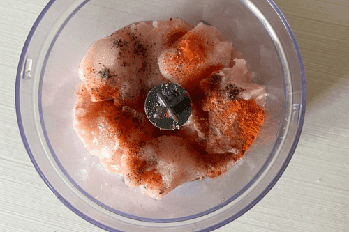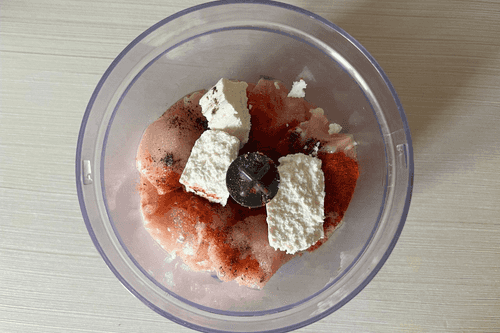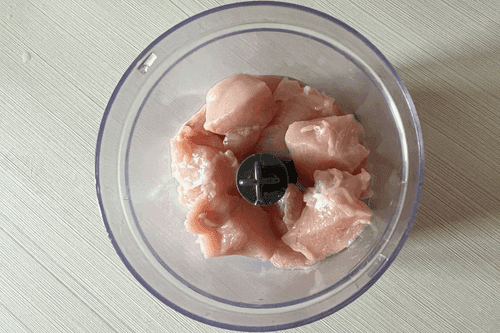 Cut the chicken fillet into pieces and place it in the blender bowl.