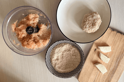 Pour the breadcrumbs into a separate container. Cut the cheese into pieces (the recipe calls for Adyghe cheese). Take a spoonful of the blender mixture, place a piece of cheese in the center, shape into patties, and coat in breadcrumbs.
