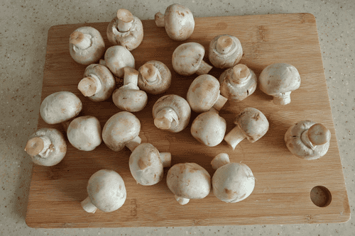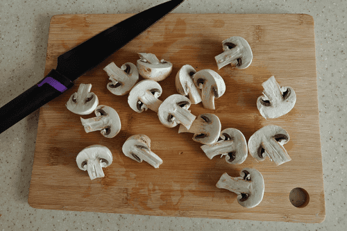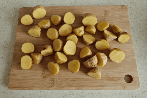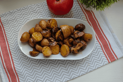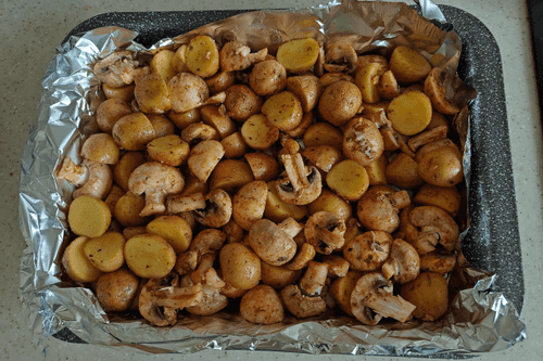 Mix the potatoes with mushrooms and place on a baking sheet lined with foil. Bake for 40 minutes at 200 degrees.