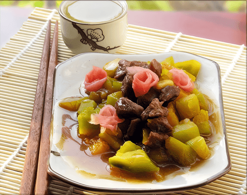 Combine soy sauce with sugar and sake, mixing thoroughly. In a thick-walled pot or pan, add finely chopped or ground ginger, pour in half of the soy mixture, and heat well.