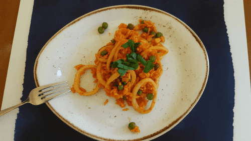 Cook for about three more minutes, then mix the rice with the squid on a plate and serve.