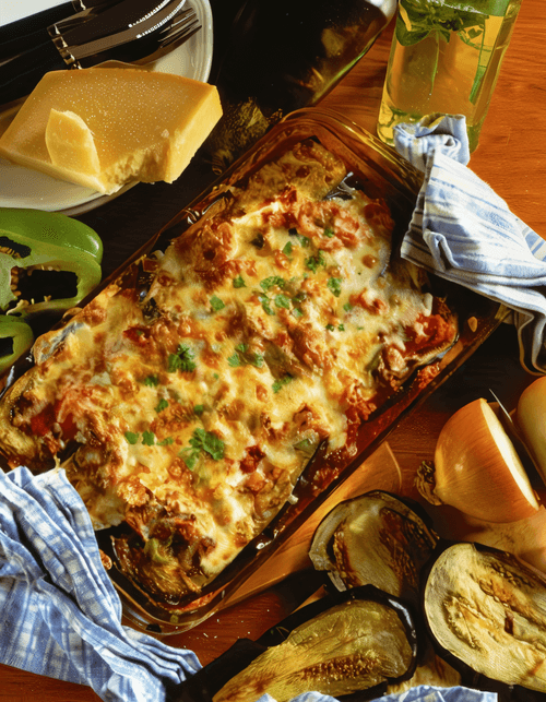 Layer half of the tomato-meat sauce in the same dish, then half of the eggplants, followed by more sauce and more eggplants. Top with thinly sliced tomatoes. Place in the microwave for 10 minutes.