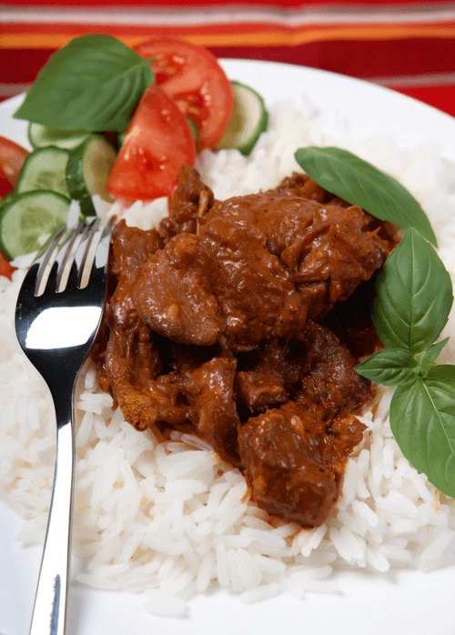 Heat oil in a pot and fry the lamb cut into 4 cm pieces in batches. Add sliced onions and peppers, minced garlic, season, and simmer for 25 minutes.