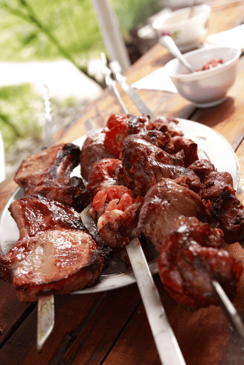 Pork shashlik with plums is a magnificent dish of Georgian cuisine that combines spicy spices and sweet fruit notes. It reveals the beauty of Georgia's gastronomic culture, where meat is prepared with aromatic marinades and fresh ingredients. The pork fillet is infused with a mixture of spices including hot chili pepper, cumin, and brown sugar, creating a rich flavor with a hint of caramel sweetness. The tender meat is harmoniously complemented by juicy plums that become soft when grilled and add a pleasant tartness to the shashlik. The finishing touch is red currant jelly that gives the meat shine and a fruity accent. This dish is perfect for warm evenings outdoors, creating an atmosphere of celebration and enjoyment of Georgian traditions.
