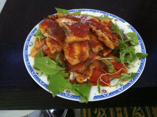 Garnish the fish with boiled rice and eggplants or cucumbers sautéed in butter with dill.