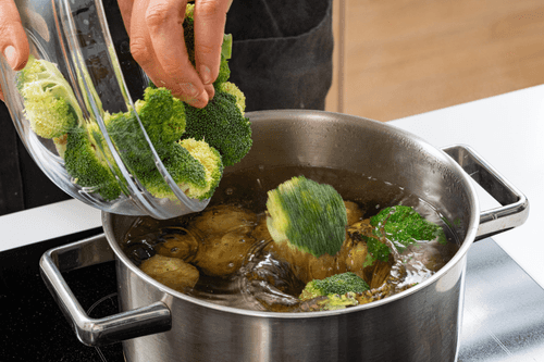 Add broccoli to the potatoes and boil for another minute. Then drain the water.