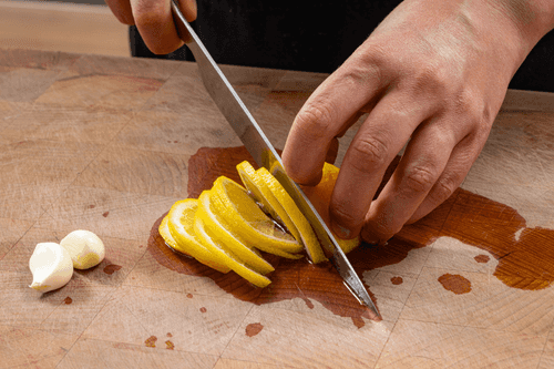 Slice the lemon into thin half-rings. Cut the garlic into slices.