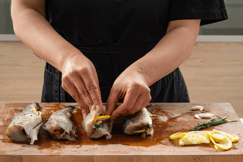 Insert lemon, a clove of garlic, and a sprig of rosemary into the belly. Let marinate for 15 minutes.