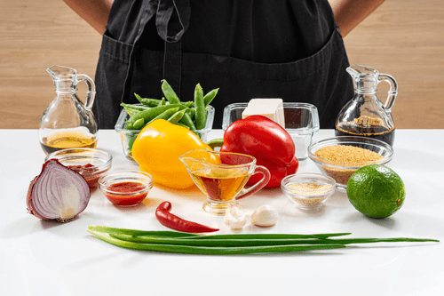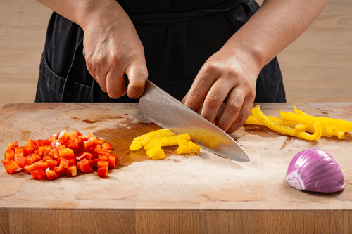 Remove seeds from both types of sweet peppers and cut them into 1 cm cubes. Cut the onion into the same cubes.