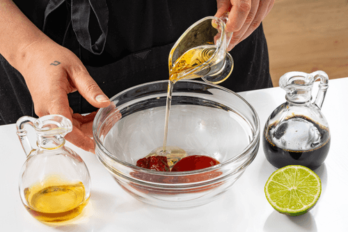 In a large bowl, mix sesame oil, sriracha, soy sauce, ketchup, rice vinegar, and 1 tablespoon of lime juice.